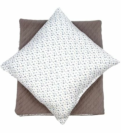 Skønt Asi dukketilbehør bestående af en pude og et tæppe. Tæppet er gråt på den ene side og hvid med blå blomster på den anden. Puden er hvid med blå blomtser.