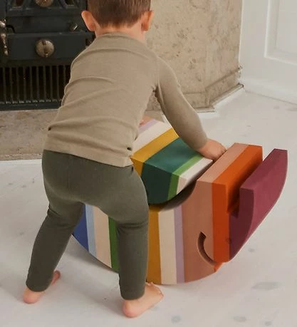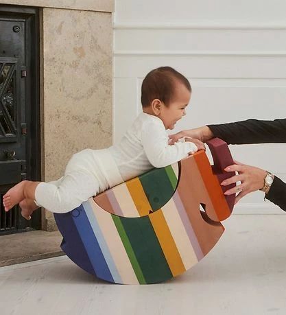 Når man vender kyllingen om, bliver den til en sjov vippe, som både de helt små, de større og de helt store børn kan bruge mange timer på at lege med. Det mindste barn kan vippe lige så stille, mens de større børn kan prøve at holde balancen på maven, numsen eller på fødderne.