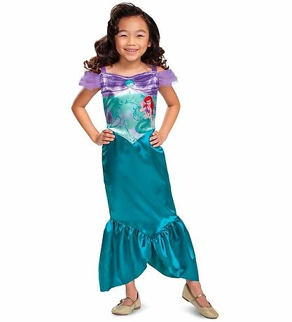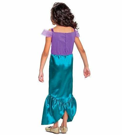Ciao Srl. prinsessekjolen har smalle skulderstropper med tyl på begge sider af skuldrene. Der er et stort print af Ariel fortil med hendes flotte hale. I bunden af skørtet er der to flæser som forestiller en havfruehale, og kjolen åbnes på ryggen med velcro.