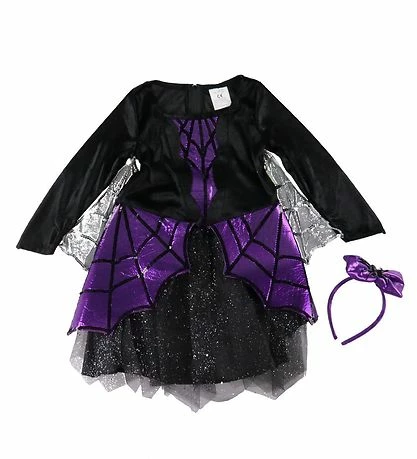Cool Den Goda Fen udklædning bestående af en sort kjole og et pandebånd i metallisk lilla. Kjolen har detaljer i metallisk lilla med sorte palietter, som ligner edderkoppespind. Under armene er der sort chiffon med sølv palietter, som ligner edderkoppespind.