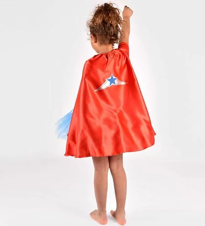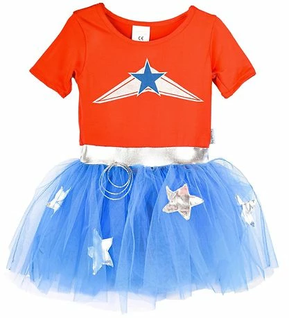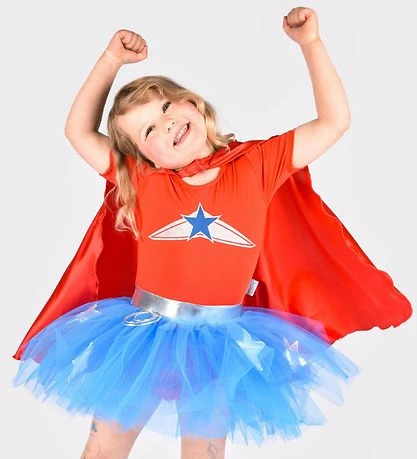 Fin Den Goda Fen udklædning bestående af en rød superheltekjole med et blåt skørt og en rød kappe. På maven og kappen er der et print af en blå stjerne med et trekantet omrids i sølv med glimmer.
