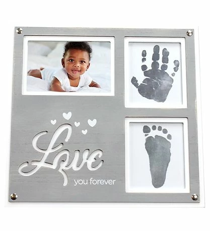 Dooky sættet er lavet så du kan forevige disse minder af din baby. I rammen er der plads til både hånd og fodaftryk i et felt samt to billeder af din baby. I højre side står der “Love you forever” samt nogle hjerter. Dette minde er perfekt til at have hængende i hjemmet eller give som en gave. Sættet laver intet roderi, og er nemt at benytte.