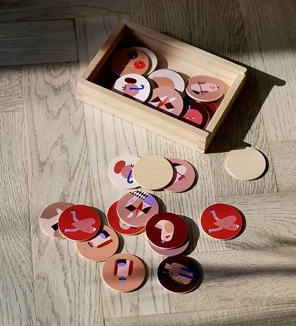 ferm Living vendespillet består af 32 brikker formet som cirkler, der sætter børnenes hukommelse på prøve. Brikkerne kommer i en flot trækasse, hvor låget skydes til siden. Brikkerne blandes og lægges med bagsiden op ad, og så skal der findes ens brikker.