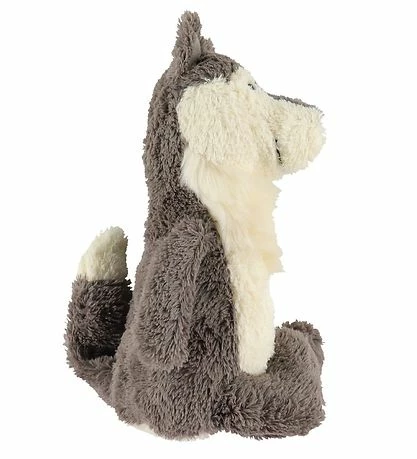 Lækker Jellycat bamse formet som en grå ulv med hvide detaljer og plysset pels fortil.