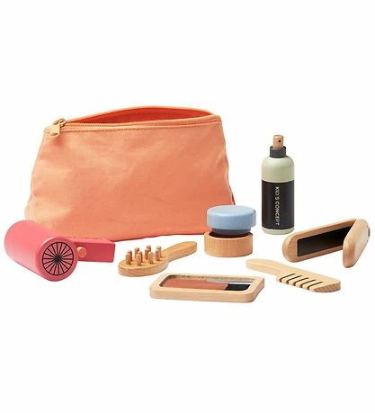 Kids Concept hårstylingssættet er super sjovt for børnene, som vil lege at de kan style hår ligesom ved frisøren eller som forældrene gør. Spraydåsen og hårtørreren har en lille knap, som kan klikkes ind.