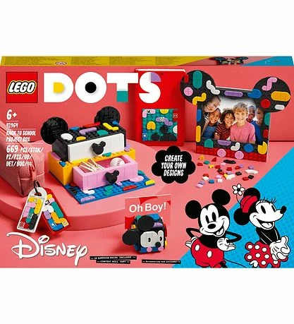 Fint LEGO DOTS sæt med i alt 669 dele, som kan samles til en skolestart-projektæske med et to-skuffesystem, billedramme, noteholder, to flade taskevedhæng og et klæbemærke, der dekoreres med farverige mosaikker i (10 med vilkårlige Mickey og venner motiver).
