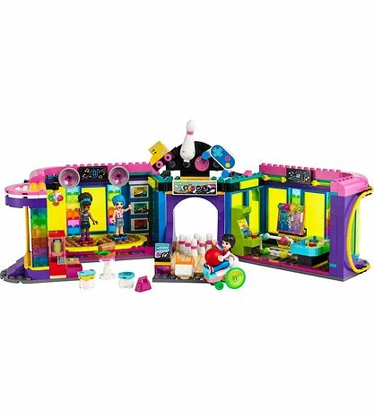 LEGO Friends sættet er det perfekte legetøj til det kreative barn, der vil bygge og lege med de tre figurer, der er taget på rulledisco-arkaden, der kan foldes ud og indeholder både et rullediskotek, en bowlingbane og et område med arkadespil. Der er mange flotte detaljer såsom en salgsautomat, rulleskøjter, mobiltelefon, bowlingtaske, bowlingkugle og kegler, sandwich, mikrofon, arkadespil, airhockeybord og dansespil.
