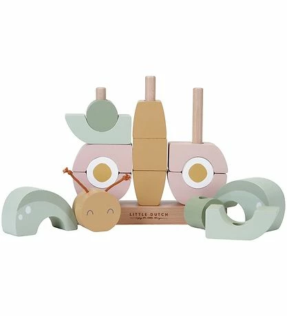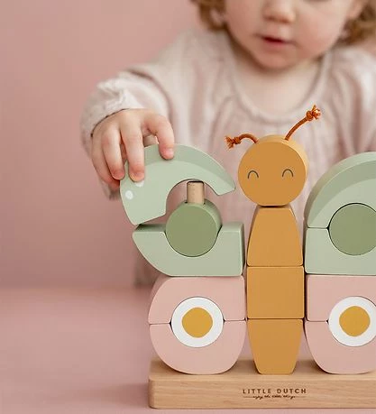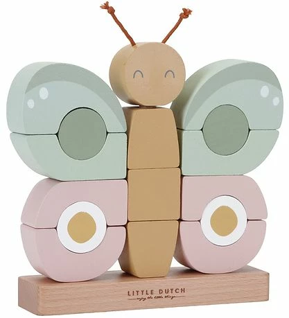 Little Dutch stablelegetøjet består af en tyk træplade med tre pinde på. Klodserne skal sættes på pindene, så de tilsammen danner en sommerfugl. Stablelegetøjet samles som et puslespil, hvor de 16 brikker danner motivet.