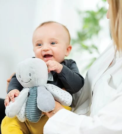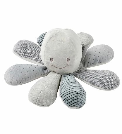 Sjovt Nattou aktivitetslegetøj i grå plys, med form som en blæksprutte med et broderet ansigt. Tentaklerne har forskellige strukturer i overfladen og er i forskellige nuancer af grå.