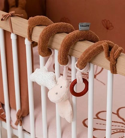 Godt Nattou aktivitetslegetøj i brun plys, med tre vedhæng under bunden af en rosa flodhest, en rød bidering og en hvid sky.