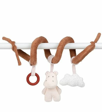 Nattou aktivitetslegetøjet er i en dejlig blød kvalitet og er formet som en spiral, som kan strækkes så den er let at hænge op lige hvor der er brug for underholdning. Den rosa flodhest og den hvide sky er begge rangler, og bideringen har forskellige strukturer til at lindre kløende gummer.