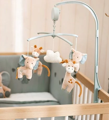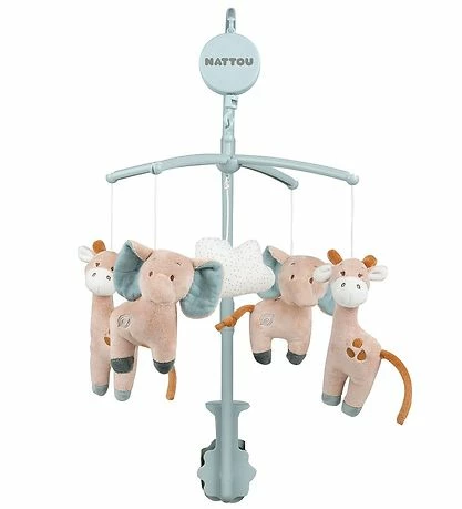 Hyggelig Nattou musikuro med fire vedhæng, to af elefanten Axel og to af giraffen Luna.