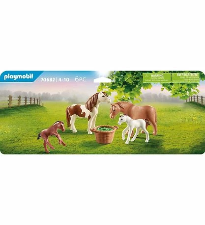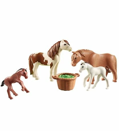 Hyggeligt Playmobil Country sæt med i alt 6 dele, der tilsammen udgør to heste og to føl med foderkurv.