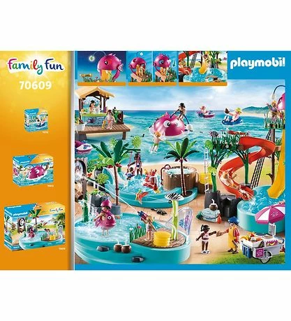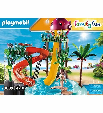 Sjovt Playmobil Family Fun sæt med i alt 132 dele, der samles til et spændende badeland med forskellige aktiviteter.