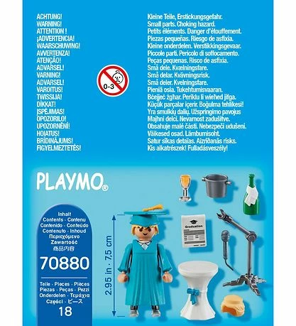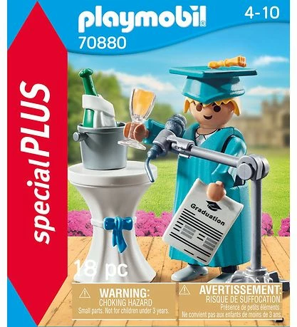 Lille Playmobil SpecialPlus sæt med i alt 18 dele, der tilsammen udgør en student, der holder tale ved studenterfesten, samt tilbehør.