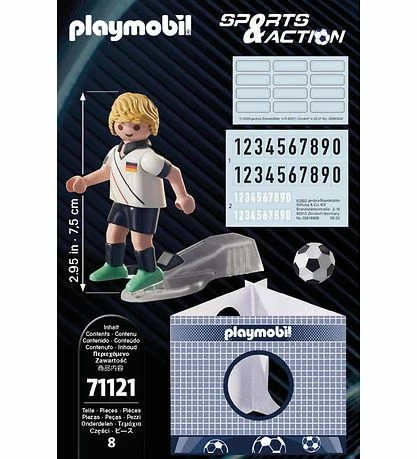 Der medfølger klistermærker, så fodboldspilleren kan gives navn og nummer. Sættet kan kombineres med Playmobil Sports & Action sættet “Fodboldstadion – 71120”.