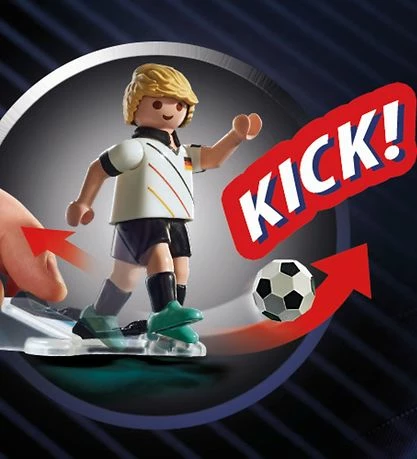 Lille Playmobil Sports & Action sæt med i alt 8 dele, der tilsammen udgør en fodboldspiller fra Tysklands landshold med en smart sparkemekanisme og en målvæg til skudtræning.