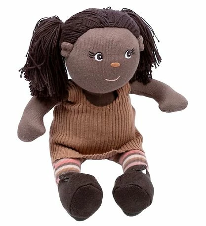 Smuk Smallstuff dukke “Rita” med mørkebrunt hår og broderede detaljer i ansigtet. Dukkens tøj er aftageligt og består af en lysebrun kjole, mørkebrune sko og stribede strømpebukser.