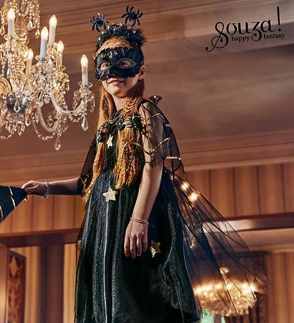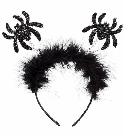 Sødt Souza hårbøjle i sort med, og på toppen er der sorte edderkopper siddende på fjedre.
