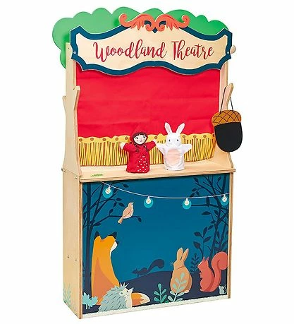 På teatrets side er gardinet det klassiske teatergardin, og der medfølger to skønne hånddukker, som er en pige og en kanin. Der er en smart tavle formet som et agern, hvor der bl.a. kan skrives dato og tid. Den indeholder mange timers leg, da der både kan laves sjove dukketeatre og sælges massere af mad på den modsatte side.