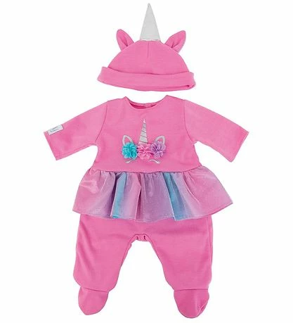 Sødt Tiny Treasures dukketøj bestående af en heldragt og en hue. Dukketøjet skal forestille en enhjørning, og på huen er der et enhjørningehorn samt to ører. På heldragten er der tre blomster fortil samt et horn, og i livet er der et tylskørt i blå, rosa og lilla med sølvglimmer.